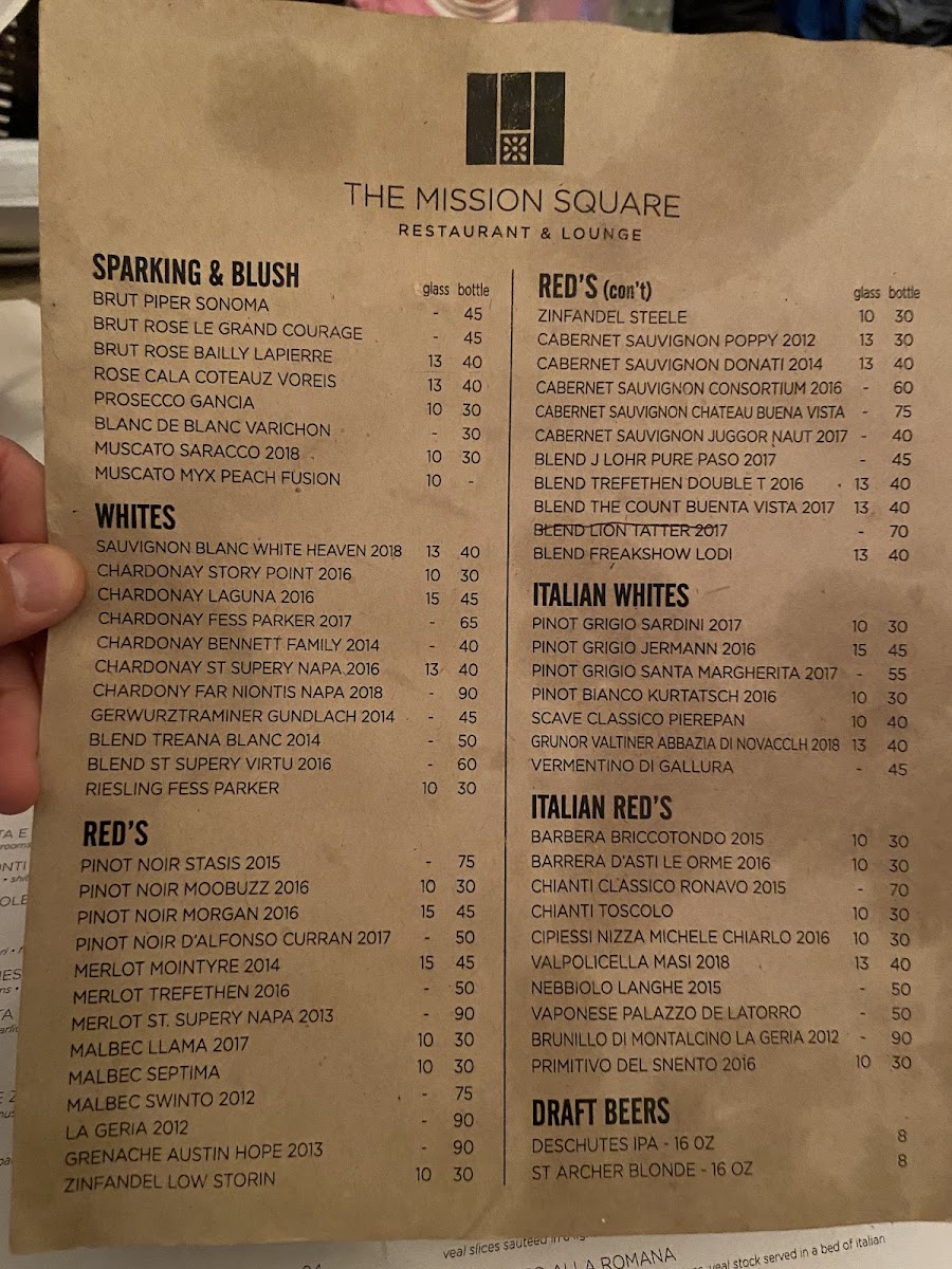 The menu at The Mission Square is a true celebration of Italian flavors. Begin your culinary journey with a glass from their impressive wine list, featuring selections like the Pinot Noir Stasis 2015 and Pinot Grigio Santa Margherita 2017. For pasta lovers, don’t miss out on the Tortolini Di Ricotta E Spinaci Alla Panna—a creamy blend of ricotta cheese, mushrooms, and spinach that melts in your mouth. The Linguine Mare E Monti provides a delightful taste of the sea, combining shrimp, baby scallops, and shitake mushrooms in a vibrant pesto sauce, while the classic Linguine Alla Vongole showcases fresh clams with garlic and parsley for a truly authentic experience.